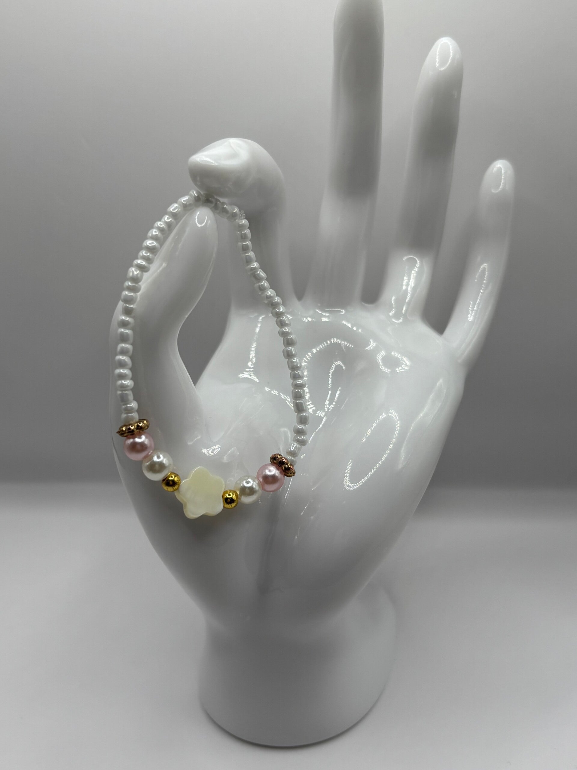 3mm seed beads with pink & white pearls, gold petals & 4mm round gold beads